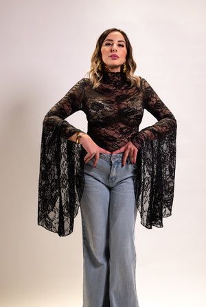 Blusa in pizzo Evelyn nero, maniche ampie sul fondo,tessuto elasticizzato.