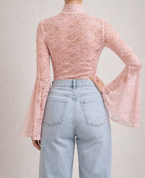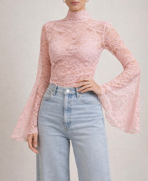 Blusa in pizzo Evelyn rosa, maniche ampie sul fondo, tessuto elasticizzato.