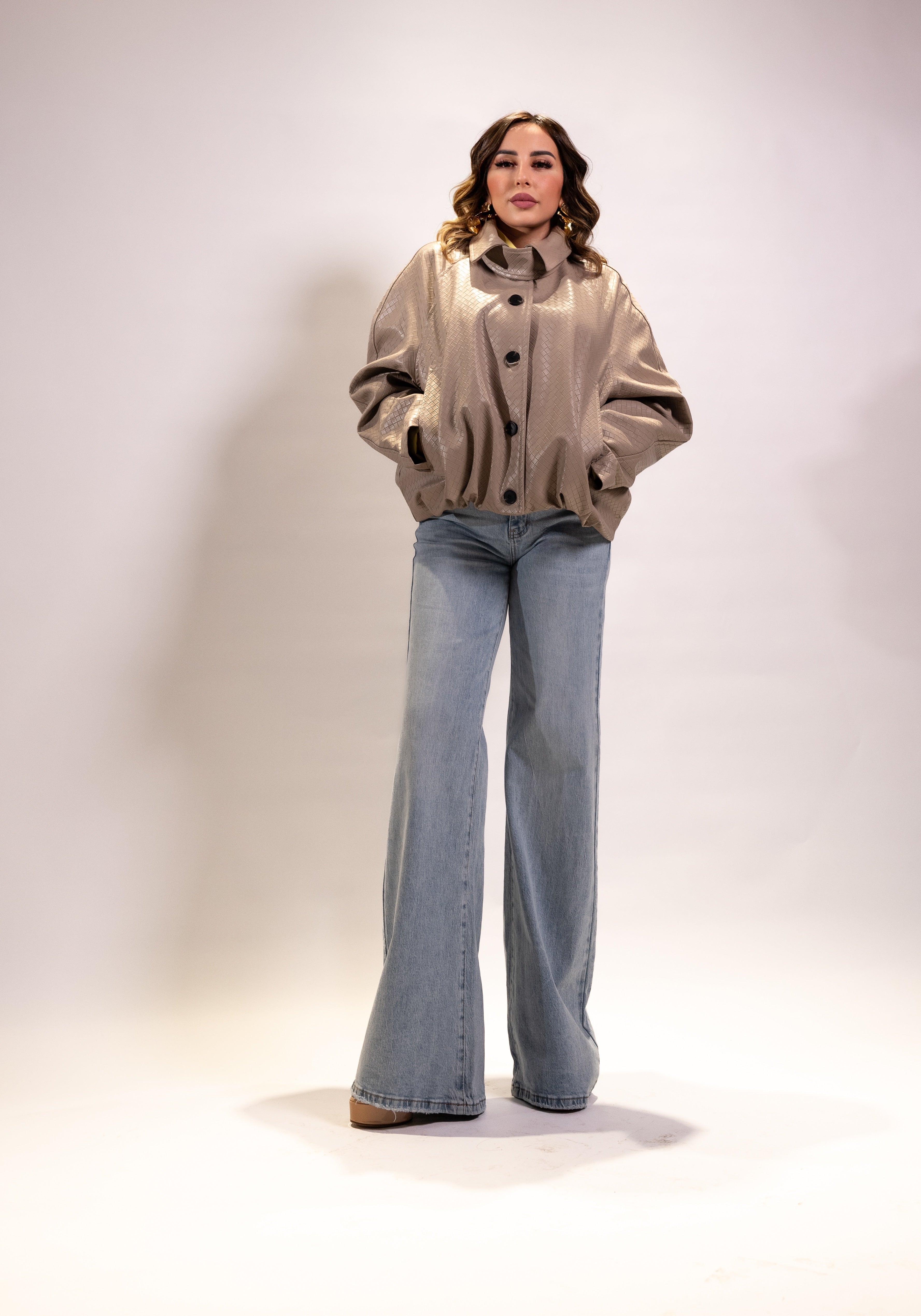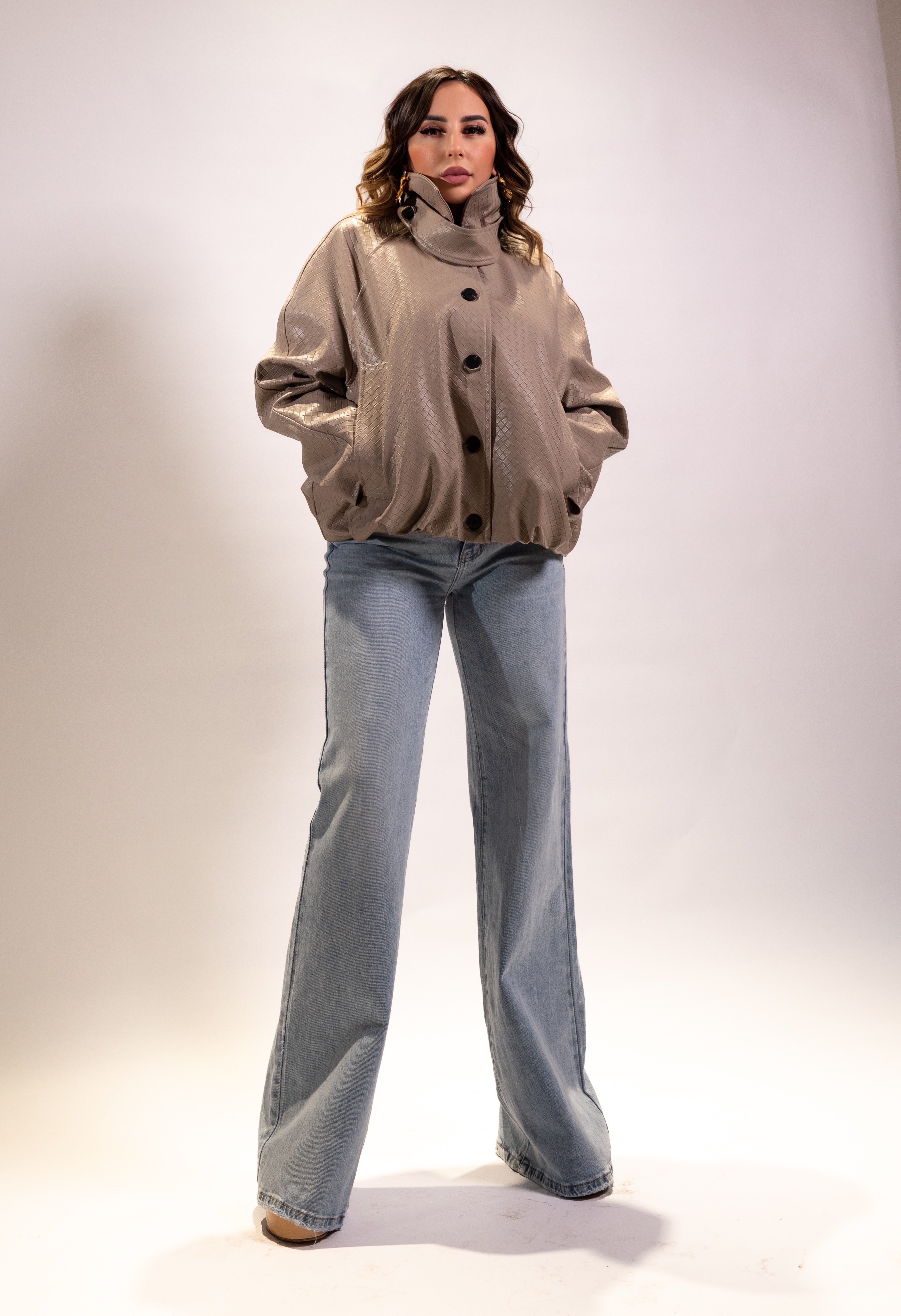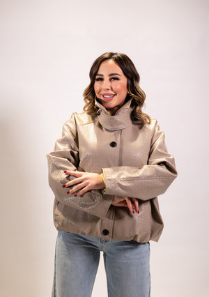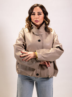 Giacca lumina in eco-pelle effetto intrecciato. Design cropped. Vestibilità boxy e maniche ampie per un look confortevole. Collo a punta. Patta sottogola abbottonabile. Fondo arricciato. Interno foderato, tasche laterali
