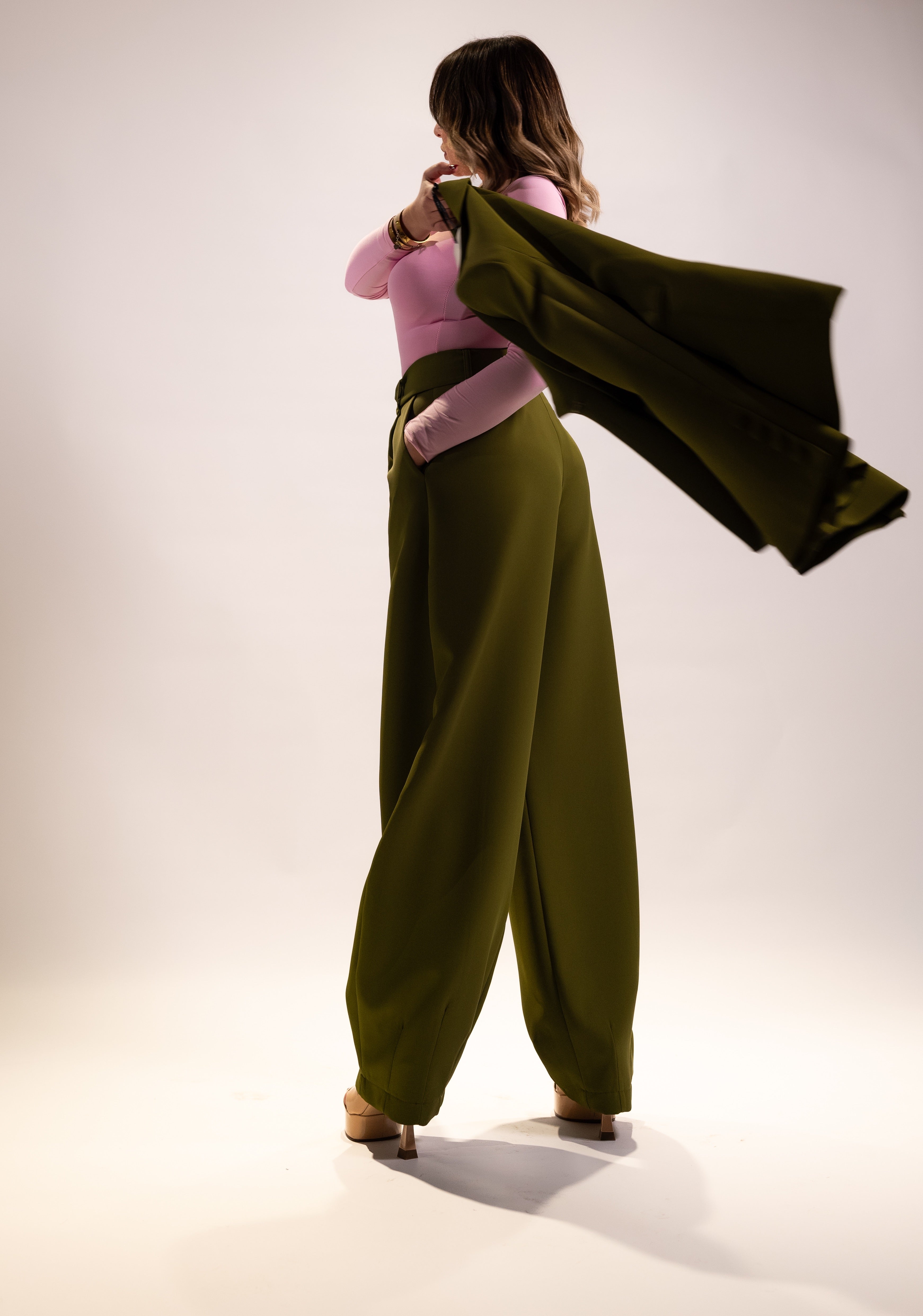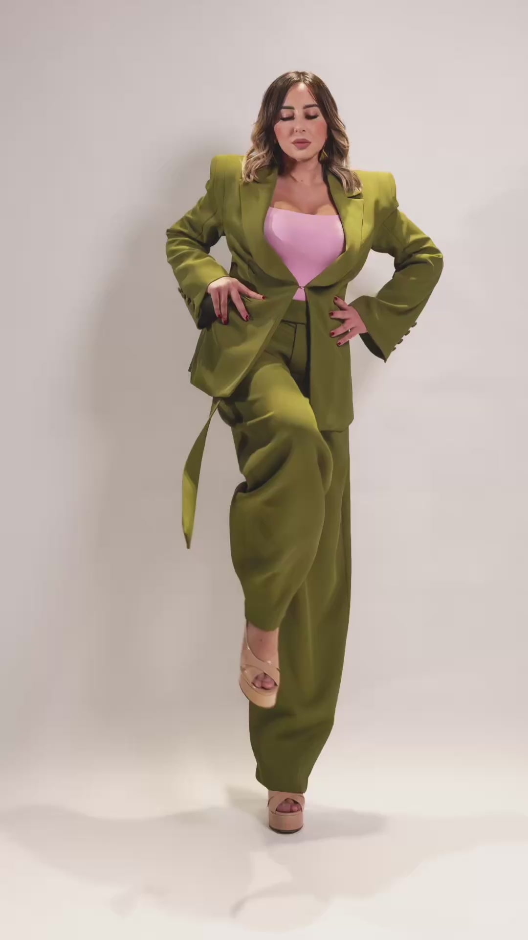 Tailleur lumina colore verde olio. Blazer sfiancato, con spallina super imbottita, pantalone wideleg.
